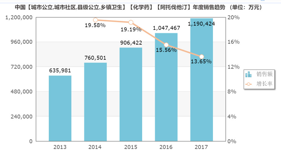 以阿托伐他汀鈣片為例,根據(jù)米內(nèi)網(wǎng)數(shù)據(jù),阿托伐他汀鈣片在中國(guó)的市場(chǎng)規(guī)模近119億,增長(zhǎng)率放緩。