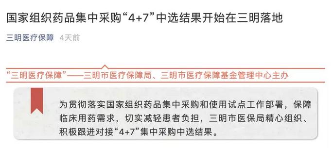 近日,三明市醫(yī)療保障管理局、市醫(yī)療保障基金管理中心主辦的公眾號(hào)“三明醫(yī)療保障”發(fā)布消息:國(guó)家組織藥品集中采購(gòu)“4+7”中選結(jié)果開(kāi)始在三明落地。
