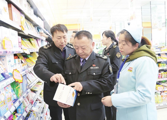 近日,安徽省阜南縣市場監管局開展醫療器械專項整治行動,進一步打擊醫療器械虛假宣傳、虛標價格等誤導消費者的行為,凈化市場環境。圖為該局執法人員在一家藥店檢查醫療器械。(陳明浩 攝)