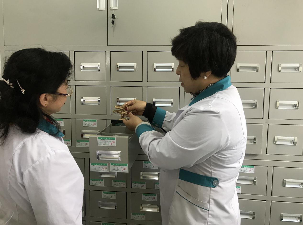 圖為王君蘭(右)和店員張俊麗檢查中藥飲片是否蟲蛀霉變。記者 付海紅 攝