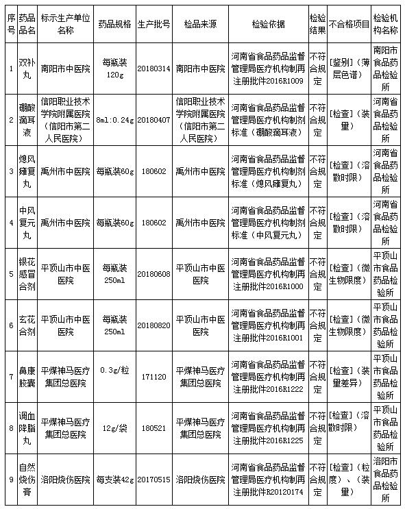 一、經(jīng)南陽市食品藥品檢驗所檢驗,標示為南陽市中醫(yī)院配制的雙補丸(批號20180314)不合格,不合格項目為薄層色譜。經(jīng)河南省食品藥品檢驗所檢驗,標示為信陽職業(yè)技術學院附屬醫(yī)院(信陽市第二人民醫(yī)院)配制的硼酸滴耳液(批號20180407)不合格,不合格項目為裝量;標示為禹州市中醫(yī)院配制的熄風癱復丸(批號180602)、中風復元丸(批號180602)不合格,不合格項目均為溶散時限。經(jīng)平頂山市食品藥品檢驗所檢驗,標示為平頂山市中醫(yī)醫(yī)院配制的銀花感冒合劑(批號20180608)、玄花合劑(批號20180820)不合格,不合格項目均為微生物限度;標示為平煤神馬醫(yī)療集團總醫(yī)院配制的鼻康膠囊(批號171120)、調(diào)血降脂丸(批號180521)不合格,不合格項目為裝量差異、溶散時限。經(jīng)洛陽市食品藥品檢驗所檢驗,標示為洛陽燒傷醫(yī)院配制的自然燒傷膏(批號20170515)不合格,不合格項目為粒度、裝量。