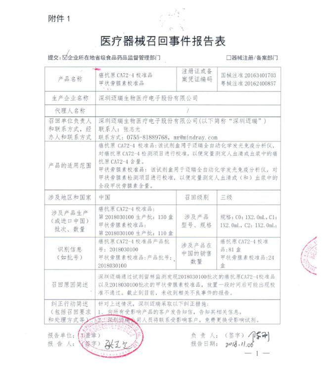 2018年11月16日,國家藥監(jiān)局發(fā)布《深圳邁瑞生物醫(yī)療電子股份有限公司對癌抗原CA72-4校準(zhǔn)品、甲狀旁腺素校準(zhǔn)品主動召回》信息(鏈接為http://www.nmpa.gov.cn/WS04/CL2135/332282.html)——“深圳邁瑞生物醫(yī)療電子股份有限公司報告,由于放置一段時間后可能出現(xiàn)校準(zhǔn)通不過,深圳邁瑞生物醫(yī)療電子股份有限公司對其生產(chǎn)的癌抗原CA72-4校準(zhǔn)品(注冊號:國械注準(zhǔn)20163401703)、甲狀旁腺素校準(zhǔn)品(注冊號:粵械注準(zhǔn)20162400857)主動召回。召回級別為三級。涉及產(chǎn)品的型號、規(guī)格及批次等詳細(xì)信息見《醫(yī)療器械召回事件報告表》。”