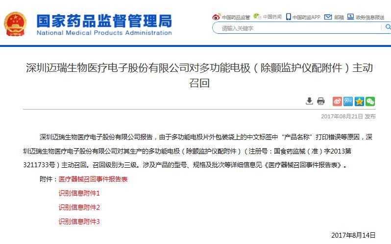 2017年8月21日,國家藥品監(jiān)管部門官網(wǎng)發(fā)布《深圳邁瑞生物醫(yī)療電子股份有限公司對多功能電極(除顫監(jiān)護儀配附件)主動召回》信息(信息鏈接為http://www.nmpa.gov.cn/WS04/CL2135/321102.html),“深圳邁瑞生物醫(yī)療電子股份有限公司報告,由于多功能電極片外包裝袋上的中文標(biāo)簽中“產(chǎn)品名稱”打印錯誤等原因,深圳邁瑞生物醫(yī)療電子股份有限公司對其生產(chǎn)的多功能電極(除顫監(jiān)護儀配附件)(注冊號:國食藥監(jiān)械(準(zhǔn))字2013第3211733號)主動召回,召回級別三級。”