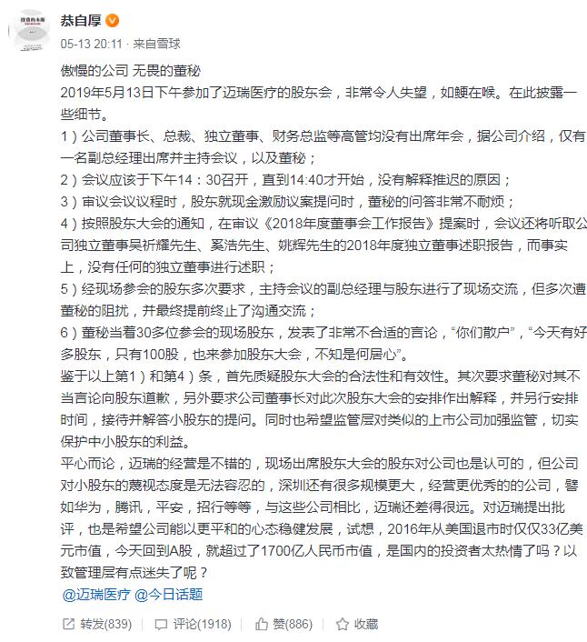 中國食品藥品網(wǎng)訊(記者 蔣紅瑜) 5月13日晚間有投資者在雪球網(wǎng)站發(fā)帖表示,當(dāng)天下午參加了深圳邁瑞生物醫(yī)療電子股份有限公司(以下簡稱“邁瑞醫(yī)療”)的股東大會,非常令人失望。該投資者稱,董秘當(dāng)著30多位參會股東的面,發(fā)表了非常不合適的言論,“你們散戶”“今天有好多股東,只有100股,也來參加股東大會,不知是何居心”。