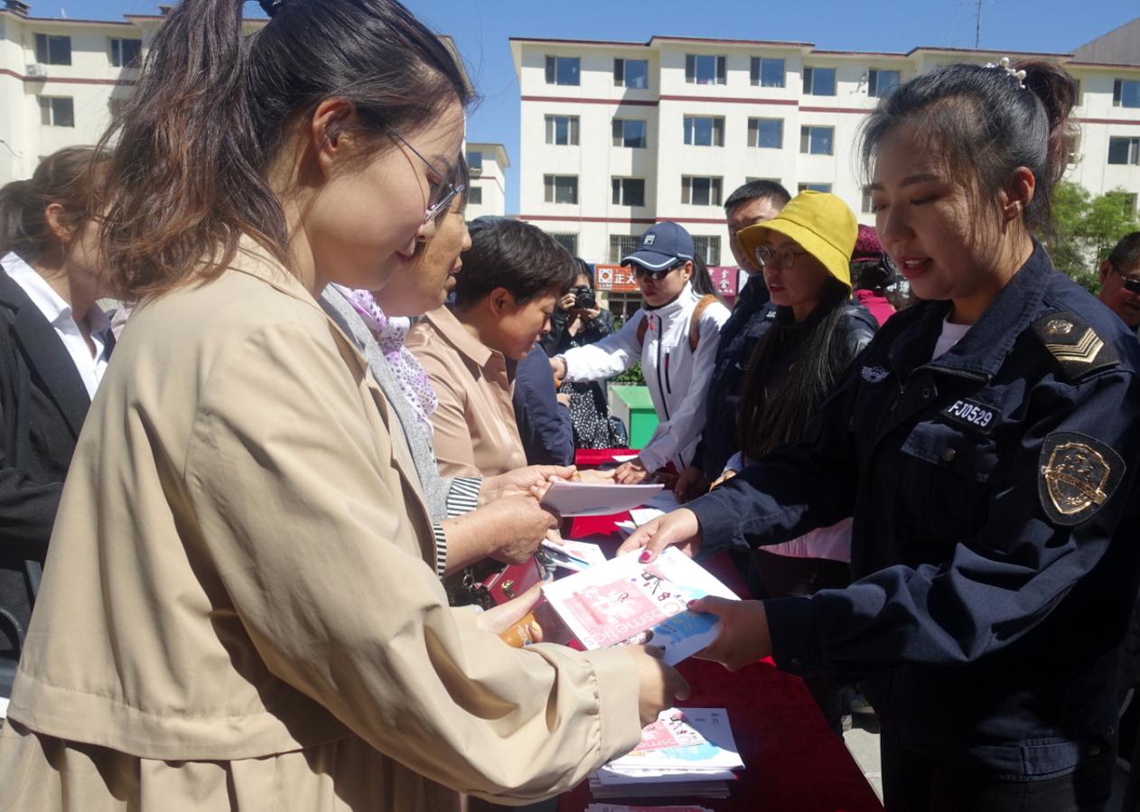 內(nèi)蒙古自治區(qū)化妝品安全科普宣傳周啟動儀式現(xiàn)場,工作人員正在發(fā)放科普宣傳資料。 楊燕/攝