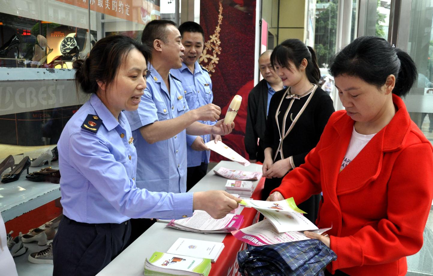 圖為該局敦仁街道市場監管所執法人員在敦仁商圈設立宣傳站,面對面向群眾講解如何鑒別真假化妝品。文光輝 攝影報道