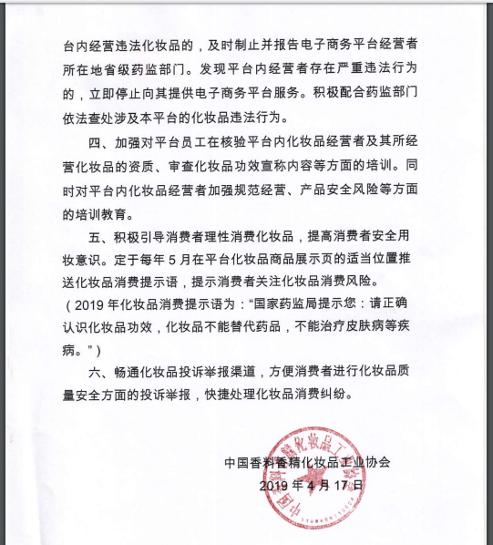 為促進(jìn)化妝品網(wǎng)絡(luò)銷售市場持續(xù)健康發(fā)展,國家藥監(jiān)局化妝品監(jiān)管司充分調(diào)動行業(yè)積極性,指導(dǎo)中國香料香精化妝品工業(yè)協(xié)會發(fā)布《關(guān)于構(gòu)建規(guī)范有序的化妝品網(wǎng)絡(luò)銷售市場倡議書》(以下簡稱《倡議書》)。《倡議書》于4月17日發(fā)布,隨后阿里巴巴、京東、聚美優(yōu)品、唯品會、網(wǎng)易嚴(yán)選、網(wǎng)易考拉、拼多多、小紅書8家主流化妝品電子商務(wù)平臺相繼簽署承諾書,承諾將嚴(yán)格履行電商平臺管理有關(guān)法律責(zé)任,自覺抵制利用網(wǎng)絡(luò)生產(chǎn)銷售違法化妝品行為。4月30日,國家藥監(jiān)局又在全國范圍內(nèi)部署開展“線上凈網(wǎng)線下清源”專項(xiàng)工作,排查處置化妝品網(wǎng)絡(luò)銷售市場安全風(fēng)險,督促化妝品網(wǎng)絡(luò)銷售者和化妝品電子商務(wù)平臺經(jīng)營者落實(shí)化妝品經(jīng)營者主體責(zé)任。5月伊始,上述8家電子商務(wù)平臺又同步上線化妝品消費(fèi)提示語“國家藥監(jiān)局提示您:請正確認(rèn)識化妝品功效,化妝品不能替代藥品,不能治療皮膚病等疾病”,提醒廣大消費(fèi)者防范化妝品消費(fèi)風(fēng)險。