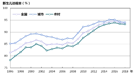 圖14 1996—2018年城鄉(xiāng)新生兒訪視率變化趨勢