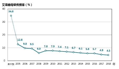 全力預(yù)防艾滋病、梅毒、乙肝母嬰傳播。為全國孕產(chǎn)婦免費提供艾滋病、梅毒、乙肝篩查,為所有發(fā)現(xiàn)感染的孕產(chǎn)婦及所生兒童提供預(yù)防母嬰傳播綜合干預(yù)服務(wù)。近年來,孕產(chǎn)婦艾滋病、梅毒和乙肝的檢測率穩(wěn)定在99%以上,艾滋病母嬰傳播率從干預(yù)前的34.8%下降到2018年的4.5%(圖9),先天梅毒報告病例數(shù)下降幅度超過70%,乙肝感染孕產(chǎn)婦所生兒童的乙肝免疫球蛋白注射率達(dá)到99.7%,有效避免和減少了兒童新發(fā)感染。