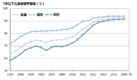 圖16 1996—2018年城鄉(xiāng)7歲以下兒童健康管理率變化趨勢