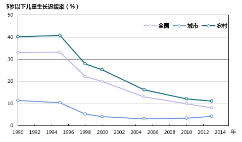 中國5歲以下兒童生長遲緩率持續(xù)下降。2013年中國5歲以下兒童生長遲緩率為8.1%,與1990年的33.1%相比下降了75.5%。