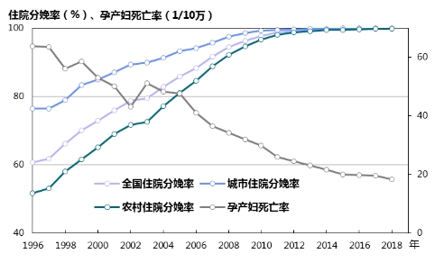 圖10 1996—2018年全國城鄉(xiāng)住院分娩率與孕產(chǎn)婦死亡率變化趨勢