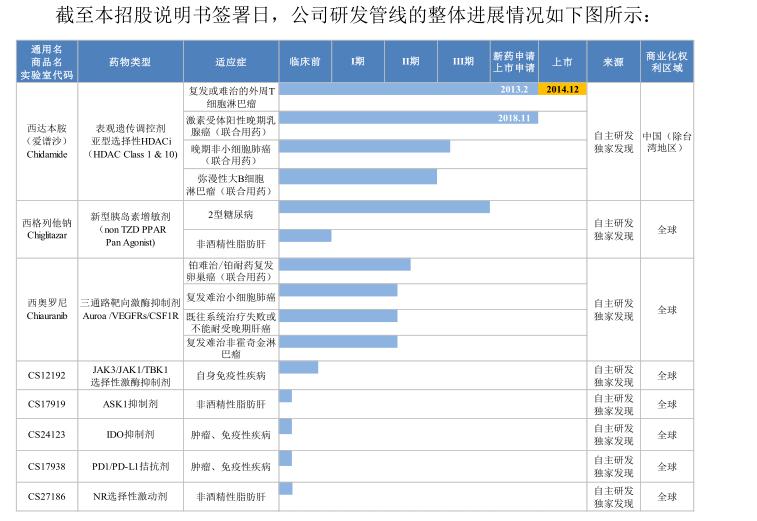 微芯生物目前僅有西達本胺一個產品上市。該品上市后,公司收入和利潤規模迅速提升,2016年、2017年和2018年,西達本胺片的產品銷售收入和西達本胺境外專利授權許可收入的合計分別為8529.96萬元、11028.87萬元和14651.14萬元,占公司同期營業收入的比例分別為99.92%、99.81%和99.20%。此外,該公司目前具有14個在研項目儲備。