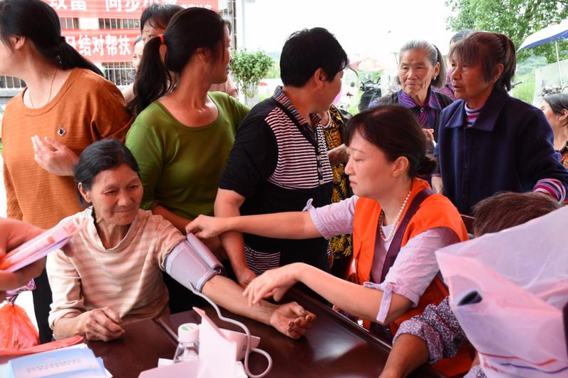 志愿者在現場為當地村民量血壓。