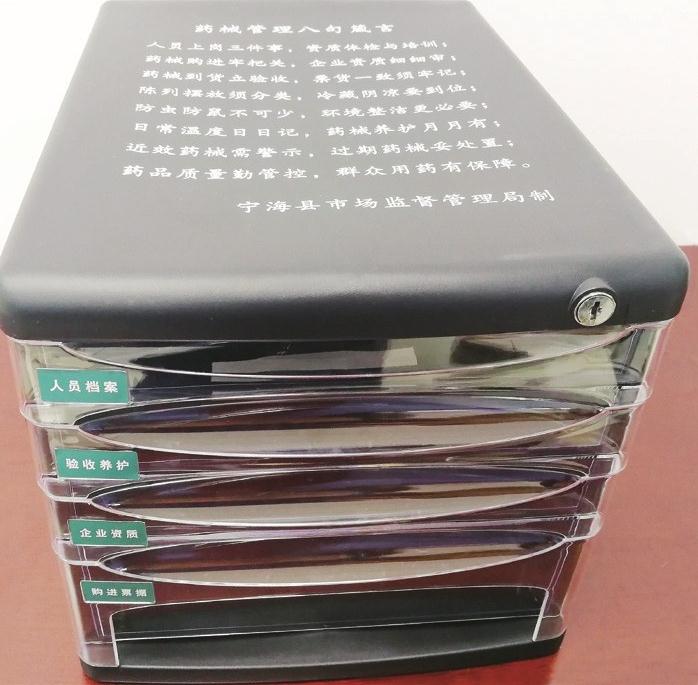 “藥械購銷票據(jù)、購進企業(yè)資質(zhì)材料是各家醫(yī)療機構(gòu)都必須保存的,因此我們就在臺賬盒上動腦筋。”據(jù)寧海縣市場監(jiān)管局藥械監(jiān)管所所長江慧琴介紹,該所統(tǒng)一制作了500個臺賬盒,將“八句箴言”印在盒上,免費發(fā)放給轄區(qū)內(nèi)基層醫(yī)療機構(gòu),強化相關(guān)負責人和工作人員的責任意識和藥械安全管理能力。