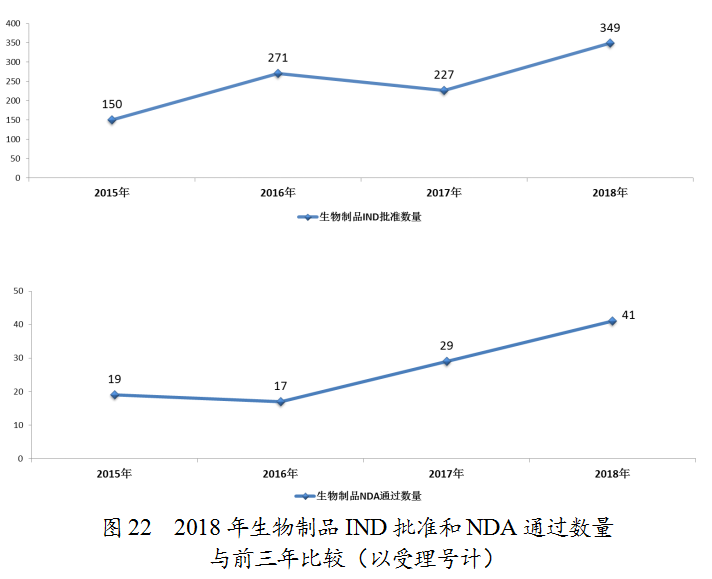 藥審中心審評通過批準預防用IND 33件,批準治療用IND 316件;審評通過預防用NDA 11件、治療用NDA 30件。2018年完成審評的生物制品各類注冊申請具體情況詳見表3,生物制品IND批準和NDA通過量與前三年比較(以受理號計)詳見圖22。
