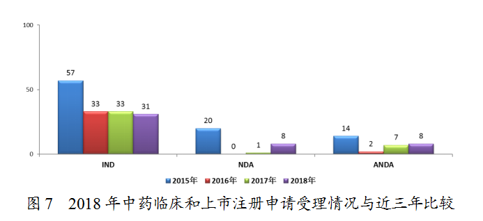 2018年,藥審中心受理1-6類中藥新藥注冊申請共37個品種,其中,受理中藥NDA 8個品種,較2017年增長了7倍;受理中藥IND 29個品種,且有1個品種為1類中藥創新藥IND申請。