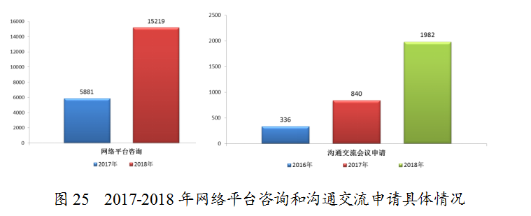 為進一步為申請人提供便利,藥審中心不斷豐富溝通交流渠道,提高溝通交流效率和質量,形成了溝通交流會議、網絡平臺咨詢(一般性技術問題)、電話咨詢、郵件咨詢和現場咨詢的多渠道、多層次的溝通交流模式。2018年藥審中心接收溝通交流申請1982件,較2017年的840件增長了136%;接收網絡平臺咨詢15219個,較2017年的5881個增長了159%,電話咨詢超過上萬次,郵件咨詢數千次,同時每周三定期開展現場咨詢。2017至2018年網絡平臺咨詢和溝通交流申請具體情況見圖25。
