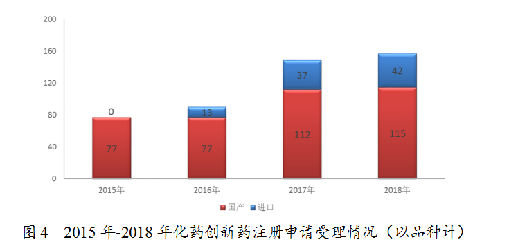 藥審中心受理1類化藥創新藥注冊申請157個品種,整體較2017年略有增加,其中受理創新藥NDA 16個品種,較2017年增長了一倍。2018年受理的157個化藥創新藥注冊申請中,國產化藥創新藥注冊申請為115個品種,進口化藥創新藥注冊申請為42個品種,2015年至2018年創新藥注冊申請受理情況詳見圖4。