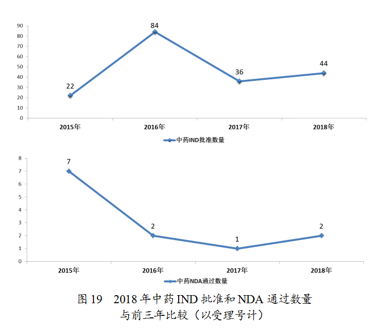 藥審中心審評通過批準中藥IND申請44件;審評通過中藥NDA 2件(涉及2個品種,關黃母顆粒、金蓉顆粒)。完成審評的中藥各類注冊申請具體情況詳見表2,中藥IND批準和NDA通過量與前三年比較(以受理號計)詳見圖19。