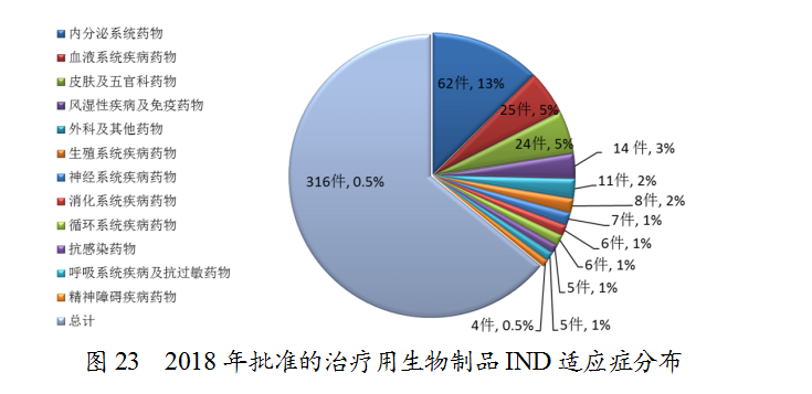 藥審中心審評通過批準生物制品IND 349件,其中批準的治療用生物制品IND治療領域分布詳見圖23。