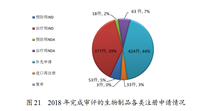 藥審中心完成審評的生物制品注冊申請共971件,其中完成預防用生物制品IND申請(預防用IND)53件,完成治療用生物制品IND申請(治療用IND)377件,完成預防用生物制品NDA(預防用NDA)18件,完成治療用生物制品NDA(治療用NDA)63件。完成審評的生物制品各類注冊申請情況詳見圖21。