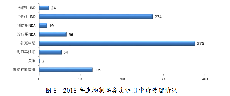 2018年,藥審中心受理1類生物制品創新藥注冊申請106個品種(包括預防用生物制品6件,治療用生物制品117件,共涉及123件受理號),較2017年增長了62%。其中,受理1類生物制品NDA 9個品種(包括預防用生物制品2件,治療用生物制品9件,共涉及11件受理號),較2017年增長了4.5倍。