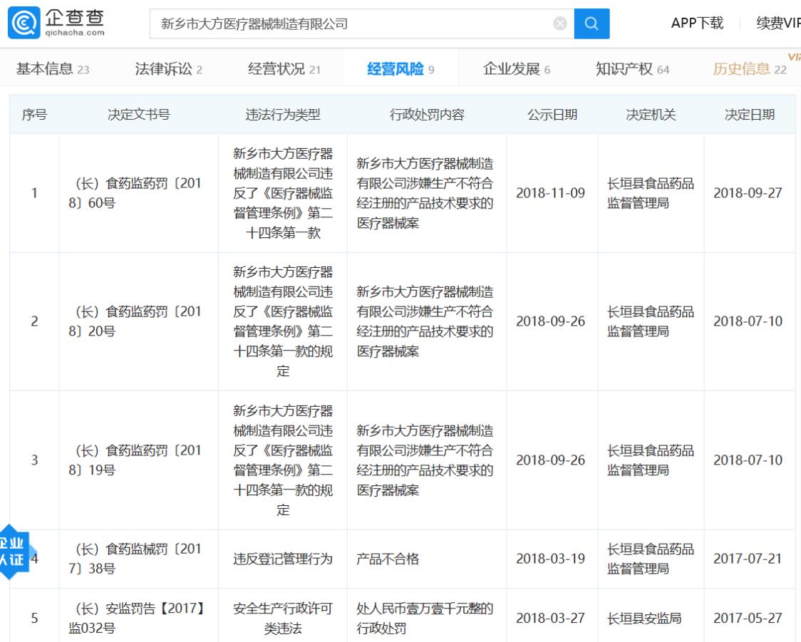 企查查平臺登記信息顯示,新鄉大方醫療公司經營范圍包括勞保用品、衛生用品、醫療用品及醫療輔助用品制造和銷售等。該企業還多次受到行政處罰,涉案生產不符合經注冊的產品技術要求的醫療器械案。