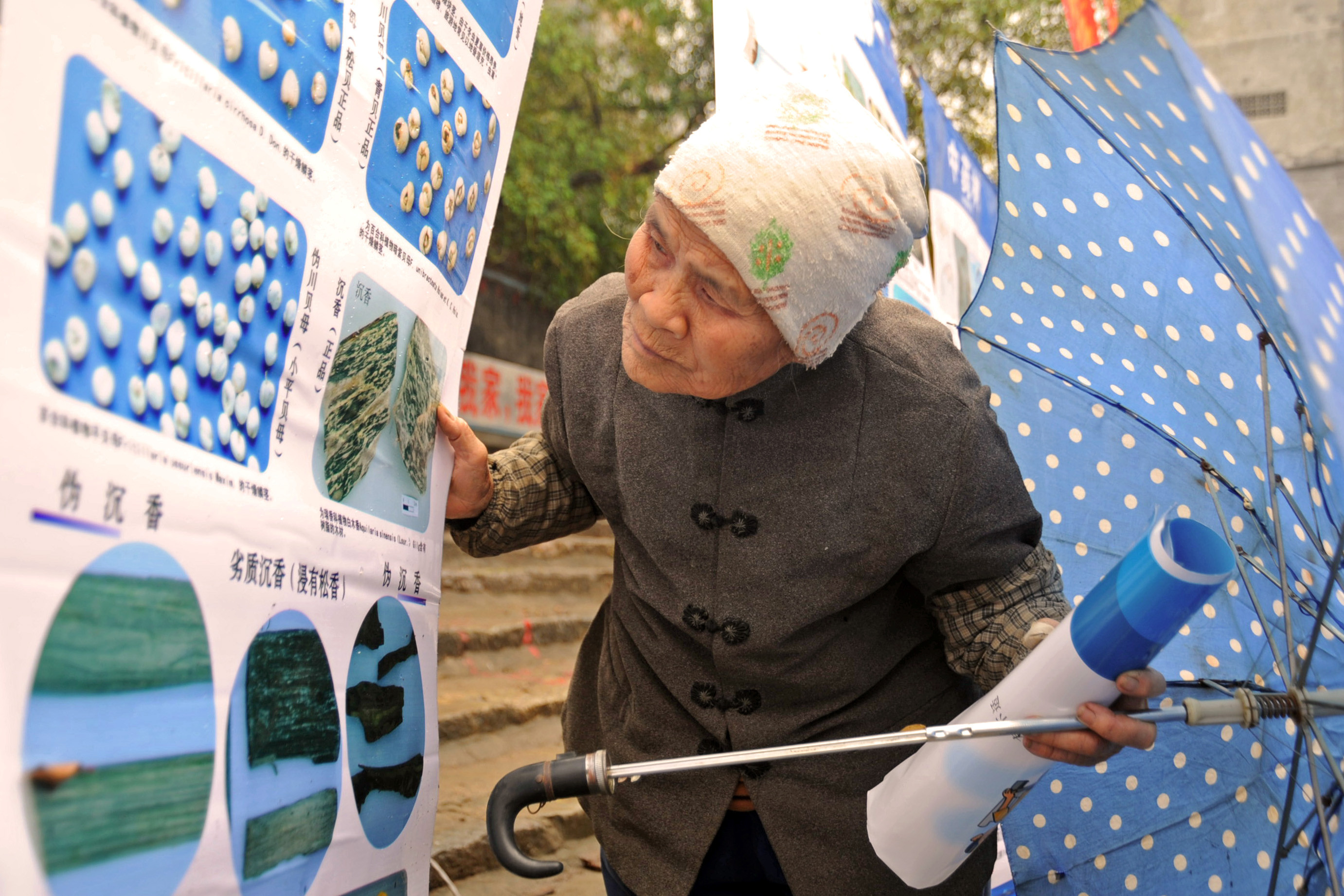 老大娘湊近假劣藥品圖片展板,想看個明明白白。